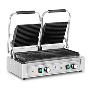 €142,00Produkt kaufenRoyal Catering RCPKG-3600-R Doppel Kontaktgrill Gastro 3.600 W geriffelt 50-300 °C 2 obere Platten: 21 x 21, untere Platte: 48 x 23 cm